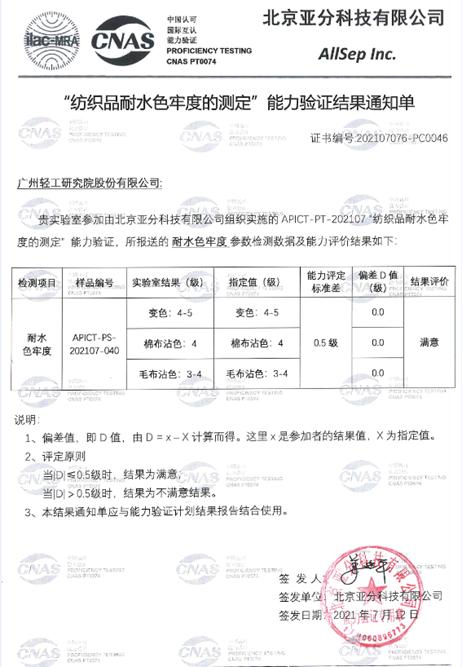 近日,广东广纺检测技术股份有限公司收到北京亚分科技有限公司6月份组织的“纺织品耐水色牢度的测定”能力验证反馈,获“满意”结果评价。