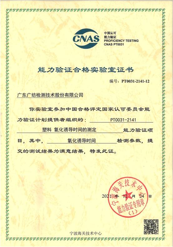 近日,广东广纺检测技术股份有限公司收到宁波海关技术中心于2021年10月份组织的“塑料 氧化诱导时间的测定”《能力验证合格实验室证书》。