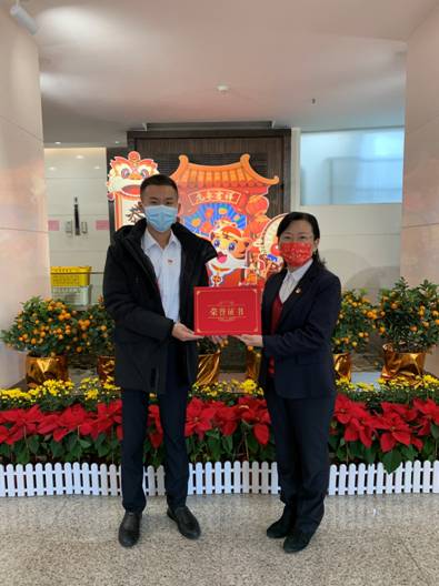 党委副书记、纪委书记、工会主席丘海澜为邓振杰送上岗位能手荣誉证书