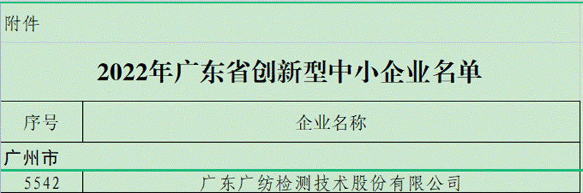 近日,广东广纺检测技术股份有限公司被评为“2022年广东创新型中小企业”。