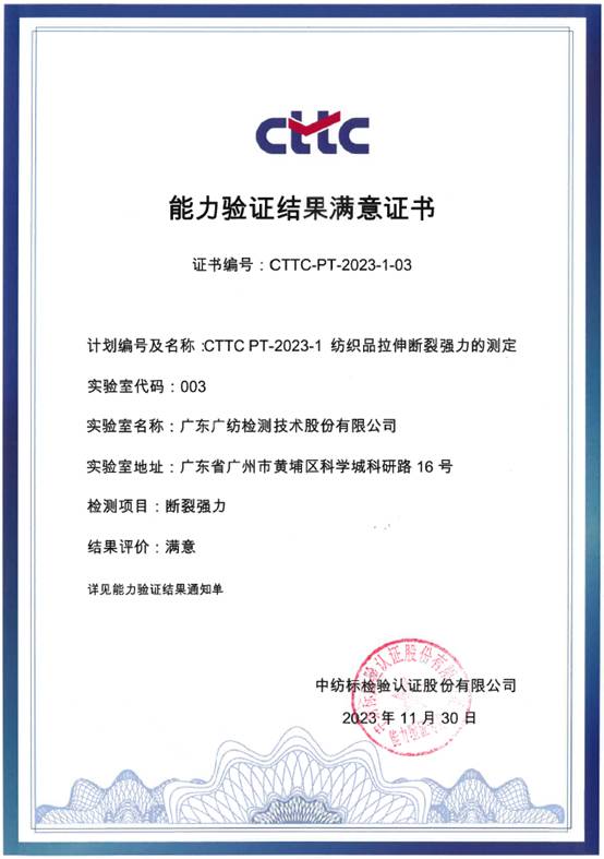 近日,广东广纺检测技术股份有限公司收到参加中纺标检验认证股份有限公司组织的“纺织品拉伸断裂强力的测定”和“纺织品耐洗色牢度的测定”能力验证结果满意通知。