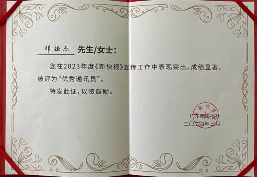 近日,广东省新快报社在羊城创意产业园举行“遇见•预见”新快报2024年度通讯员大会,来自省、市、区及各行业部门的众多通讯员代表们到场参加,其中广州轻工集团江南手机登录入口外派干部邓振杰同志在2023年度《新快报》宣传工作中表现突出,成绩显著,被评为“优秀通讯员”。